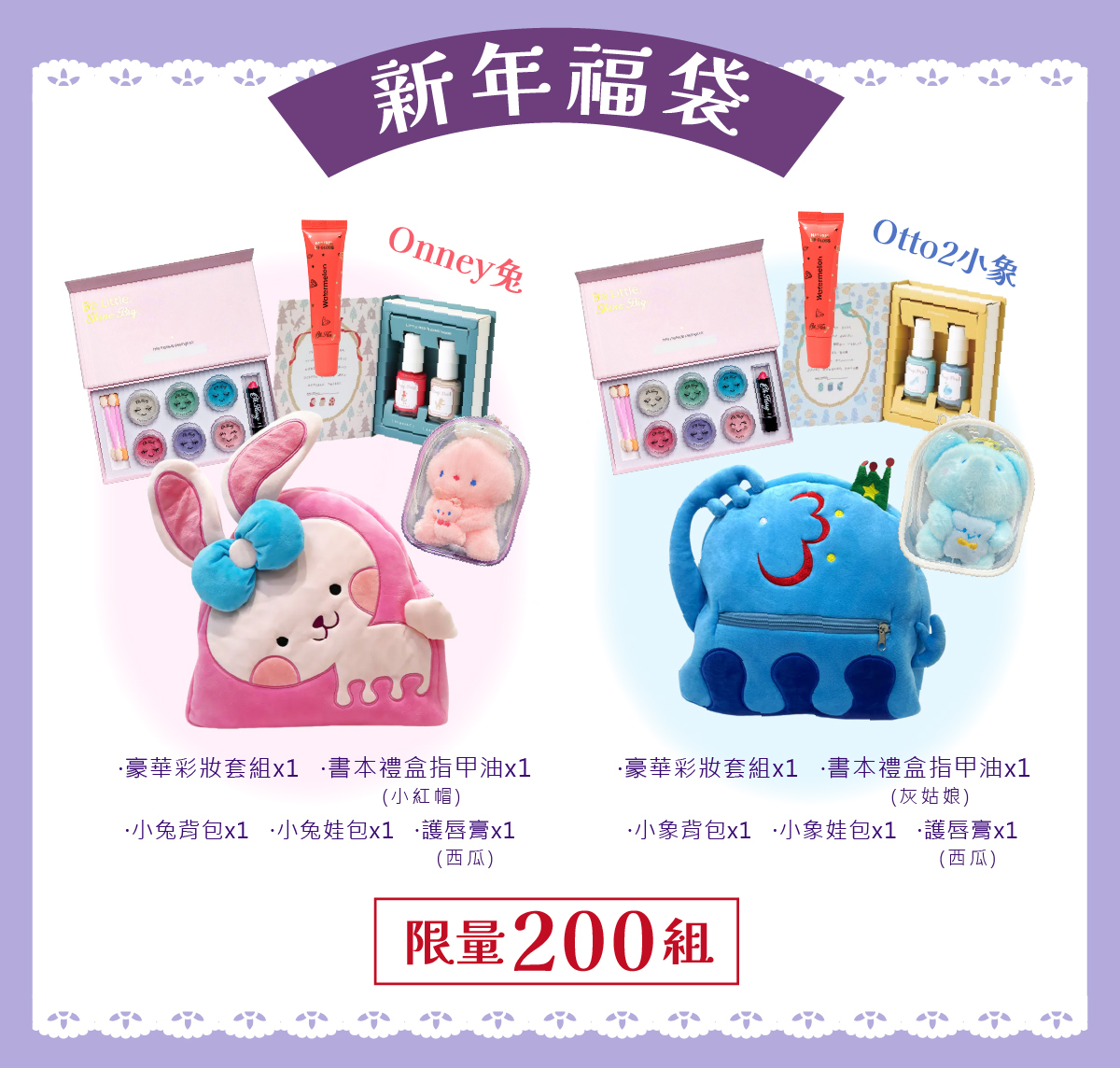 Onney小兔後背包+豪華彩妝套組+書本禮盒指甲油(小紅帽)+護唇膏(西瓜)+兔兔娃包